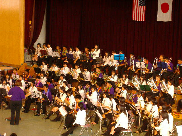 同校は、三重県高等学校文化連盟の招きによって来県したもので、41名の生徒、2名の指導者、12名の保護者が本校を訪れました。同校吹奏楽団は、6限目に体育館に集まった全校生徒の前で「タヒチタヒチ」「ハワイアンメドレー」などを演奏しました。それに続いて本校琴部の演奏、本校吹奏楽部との合同演奏と音楽による交流を行いました。短い練習時間にもかかわらず、両校の息のあった合同演奏には大きな拍手が起こりました。
