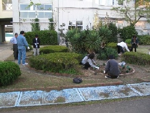 中でも、藤棚前花壇の整備では、PTA役員の方のご協力により、それまで荒れていた花壇にパンジーの花とチューリップの球根を植えていただき、明るくなった花壇の周りで楽しそうにお弁当を食べている生徒の姿も見かけられます。