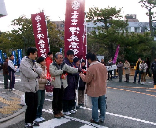 当日、本校生の受験会場になった三重大学正門付近では、進路指導部、担任団が陣取り最後のアドバイス送り激励しました。