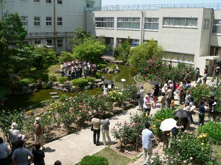 今年もバラ園にて、合唱部のミニコンサートを開催しました。快晴の空のもと、バラが満開になった中庭で100名以上の聴衆を迎え、「上を向いて歩こう」「未来へ」等6曲を披露しました。ご来校いただきました皆様ありがとうございました。