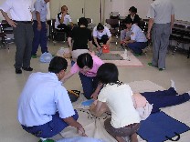 AED(自動体外式除細動器)が学校に配置されたことに伴い、AEDを用いた心肺蘇生法と、熱中症の予防及び応急手当法について講習を受け、そのあと実技練習を行い3時間の講習会を終了しました。