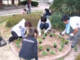 藤棚前花壇の整備では、昨年に引き続きPTA役員の方のご協力を得て、花壇にパンジーの花とチューリップの球根を植えていただきました。 美化委員が毎日水をやりながら、花が咲くのを心待ちにしているようです。また、暖かい日には、花壇の周りで楽しそうにお弁当を食べている姿も見られ、生徒たちの憩いの場となっているようです。