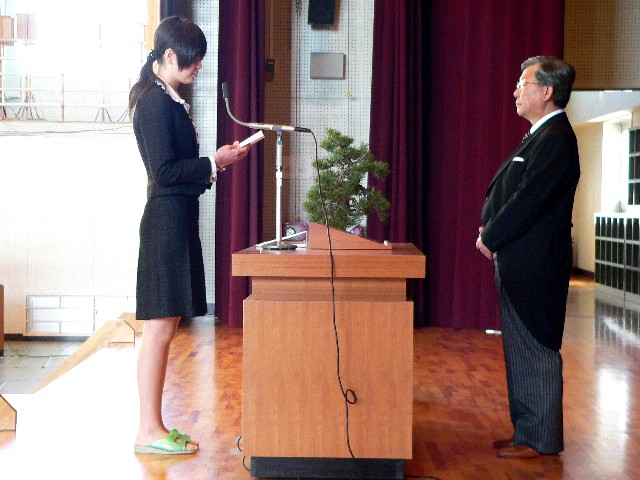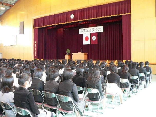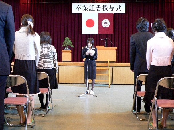 午前10時から行われた卒業式では、来賓の方々をはじめ多数の保護者、在校生の拍手の中、卒業生が入場しました。 式辞では、伊藤博和校長から、「君たちは、保護者を始め多くの方々に支えられながら今まで育ってきました。これからは社会が何かをしてくれるのではない、あなた達が何をできるかを考えて欲しい。」と、ケネディ大統領の言葉を引いて、はなむけの言葉を贈りました。 最後に、卒業生を代表して平松美貴子さんが「教科書にはない、多くのことを教えてくださった先生方は私の人生の先輩です。また、無事卒業式を迎えることができたのも、支えてくれた家族のお陰です。有り難うございました。」と答辞を述べて、3年間過ごした学舎を後にしました。