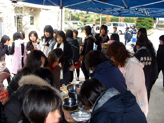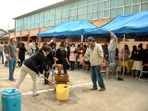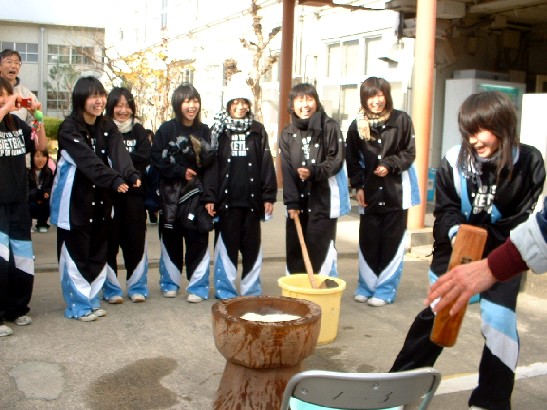 当日は、薄曇りの肌寒い天候でしたが、生徒約40名、PTA・教職員20名が参加して、午前中、クッキー作りと餅つきを行いました。 クッキー作りは、生徒会執行部が用意したレシピにそってテキパキ?と出来ました。 餅つきは、大半の生徒がはじめて、しかも、参加はほとんどが女子生徒と言うことで、不安いっぱいのスタートでしたが、生徒はすすんで餅つきに参加。手返しにも積極的に挑戦し、笑いいっぱいの餅つき大会となりました。お昼は、つきたてのお餅とPTAの方々に用意をしていただいた豚汁を美味しく、また、お腹いっぱいにいただきました。