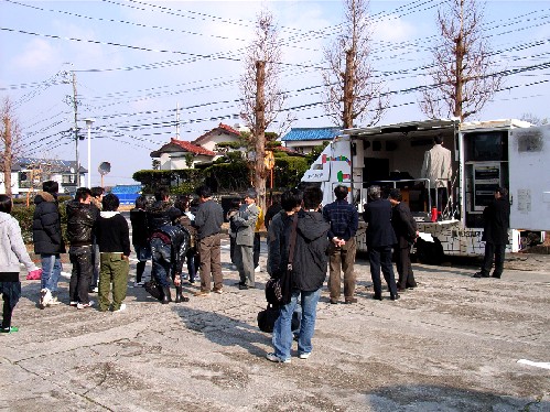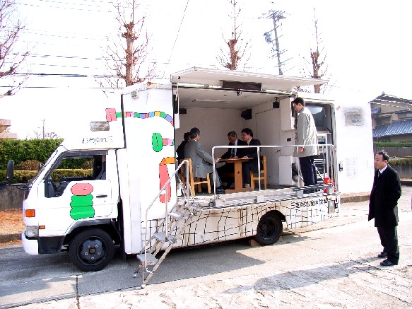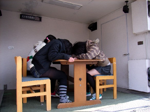 今日は、防災講話の後、県から起震車を招いてクラスの代表生徒に地震の揺れを体験