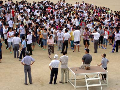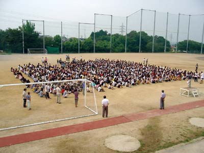 午前8時50分、大地震が発生したとの想定の下、緊急放送に従い、各教室から避難経路を通ってグランドに避難しました。整列、点呼の後、教頭から訓練結果の講評、係の先生から講話がありました。