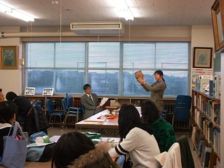 まず長遺跡では丘陵に50棟以上建物が、また次の森山東遺跡では、300以上の水田が、3番目の橋垣内遺跡ではいくつかのお墓が確認されている、とのお話でした。 他に土の色や質で分析する方法もお話していただき、弥生人が実際に使っていた土器や石器に触れるというまたとない機会を得ました。