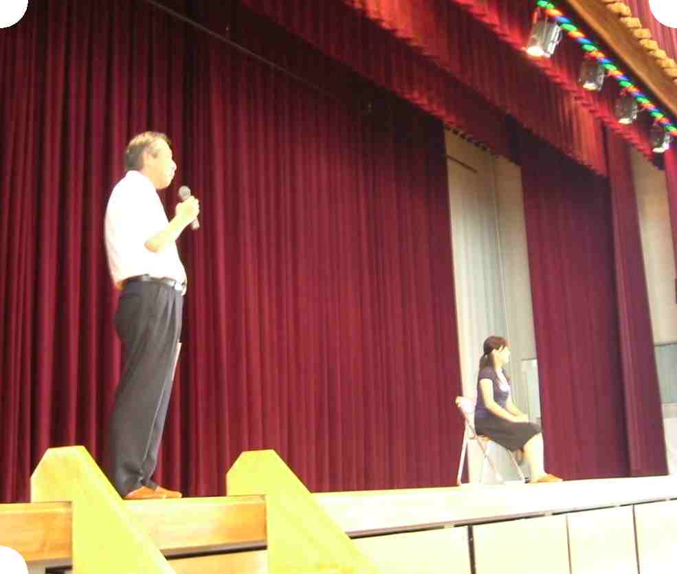 平成21年8月28日(金曜日)、津東高校では始業式と木野谷弘子先生の離任式が行われました。木野谷先生には4月から5か月間、本当にお世話になりました。2年生から花束が贈られました。また、2学期の始業にあたって、校歌斉唱に続き岡谷校長の式辞がありました。特に、8月に東名高速を分断した地震の話から東海地震・東南海地震に備える防災の話と、新型インフルエンザに対する諸注意と感染防止についての話は、生徒たちも真剣に聴いていました。 2学期は学園祭、修学旅行、そしてセンター試験出願と色々なことが予定されています。元気でしあわせな学期になることを祈っています。