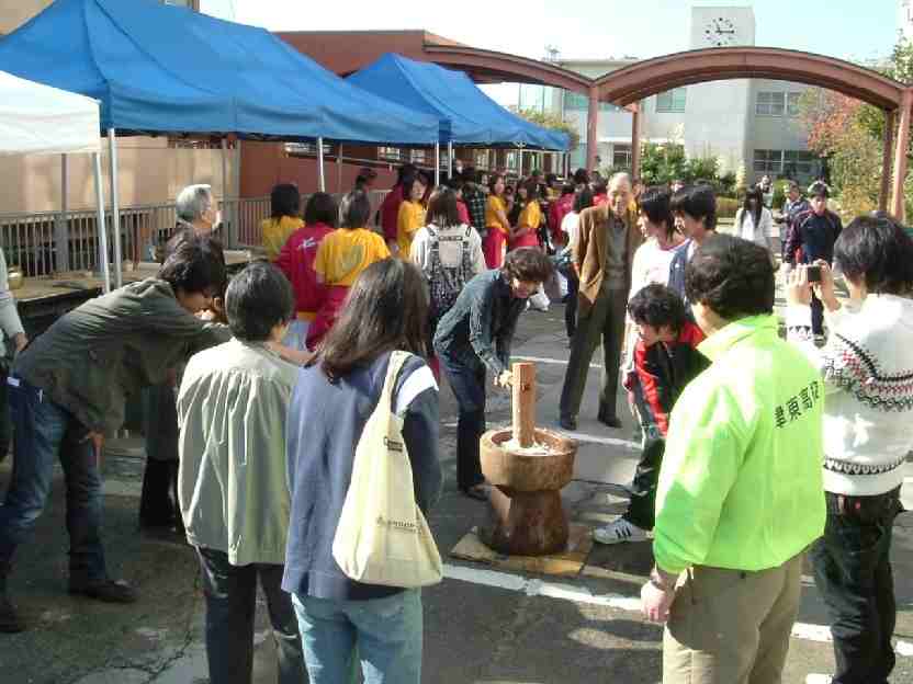 吹奏楽部の演奏、ダンス部のパフォーマンスの後、生徒会の餅つき大会が行われ、つきたての餅やPTAの作った豚汁が振る舞われました。地域の子供達も高校生の力を借りて、大きな杵で餅つきを楽しんでいました。