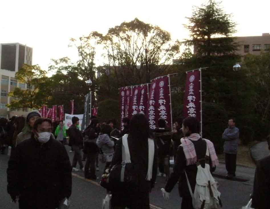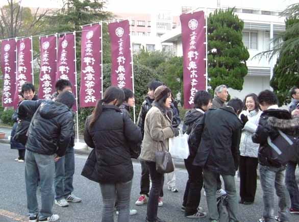 津東高校の受験生が集まる三重大学の構内には、校長先生、教頭先生、第3学年の先生方、進路指導部の先生方が、応援に駆けつけました。津東高校の旗が、ひときわ美しく朝日に映えていました。