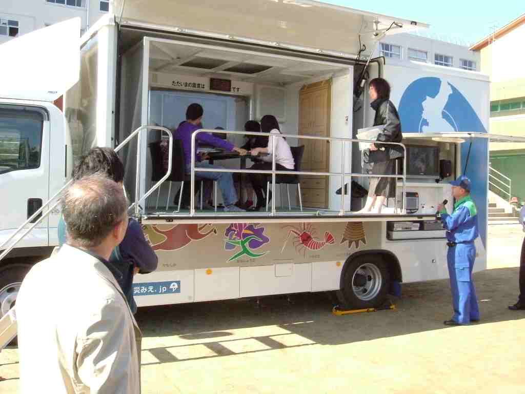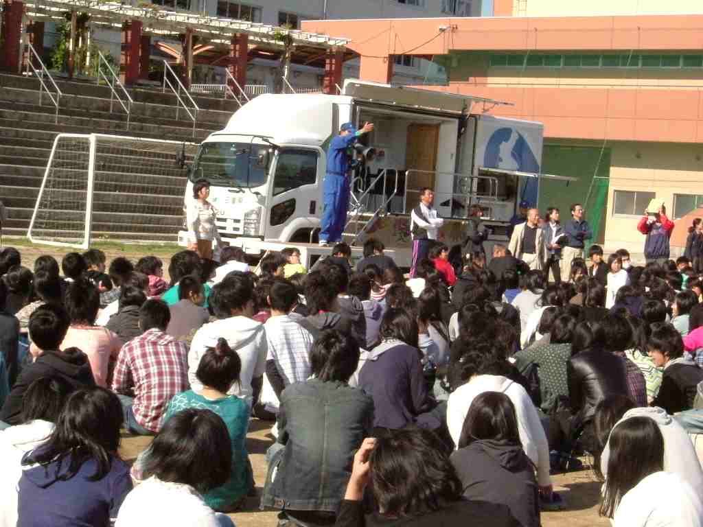 緊急地震速報を用いたグラウンドへの避難訓練の後、4台の防災啓発車を使って、阪神淡路大震災を知らない世代に震度7弱の体験をしてもらいました。生徒たちは、好奇心半分、怖さ半分、でも、本当の地震の恐ろしさを体験したようです。