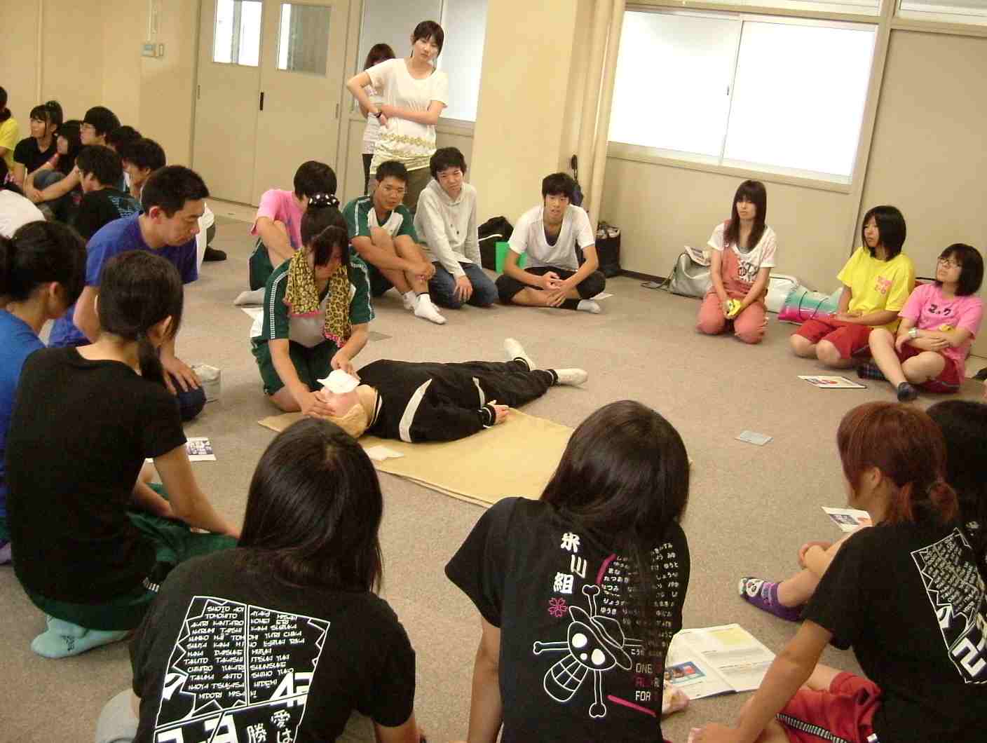 厚生部では、夏休みを前に、運動クラブの生徒を対象に救急救命法講座を開きました。 津市北消防署から救急救命士や隊員に来ていただき、講習や心肺蘇生法(人工呼吸等)、AEDの使用講習など、3時間にわたって行っていただきました。 特に〈心肺蘇生法〉の講習では、傷病者の発見、周囲の安全確認、119番通報とAEDの手配、気道の確保と人工呼吸、胸骨圧迫など、シュミレーションをまじえた実践的な訓練となりました。緊急時に役立つ講習会となりました。 各部から選手やマネージャー、31名が参加し、長時間熱心に講習を受けていました。 これから夏休みが始まります。部活動を含めて、安全な環境づくりを担う主体的存在として頑張ってほしいと思います。 また、クラブを指導される先生方も8名が参加されました。修了者には、「普通救命講習修了証」が交付されます。