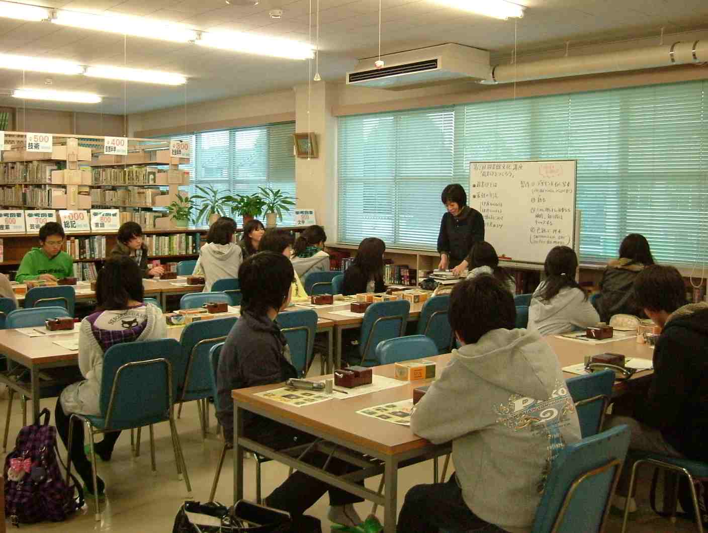 まず、司書の淺生先生から蔵書印についてのお話があり、図書委員から篆刻(てんこく)の方法について説明がありました。印床(いんしょう)や印刀(いんとう)使い方についてや刻り方のコツについて丁寧に説明してくれました。それからいよいよ篆刻です。
