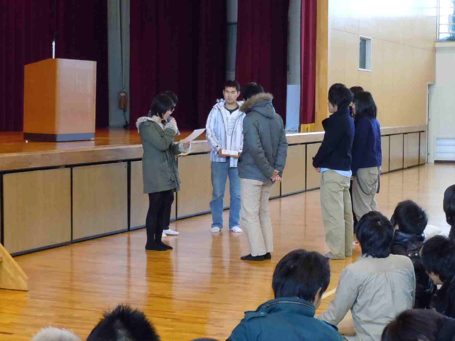 始業式後、特活部の倉岡先生から、ペットボトルキャップ回収についての報告がありました。今回は約3万6千個、297人分のワクチンが作れました。 その後、生徒会執行部より、頑張ったクラスに対して表彰状が送られました。 1位は3年4組、3440個 2位は2年7組、3256個 3位は1年8組、3180個でした。