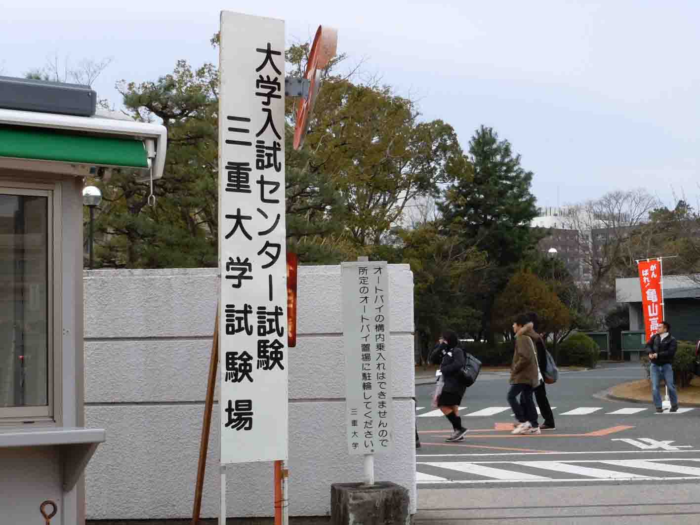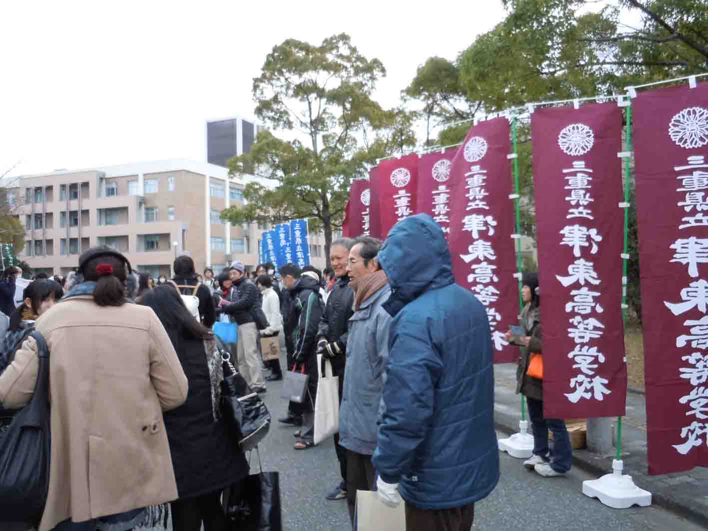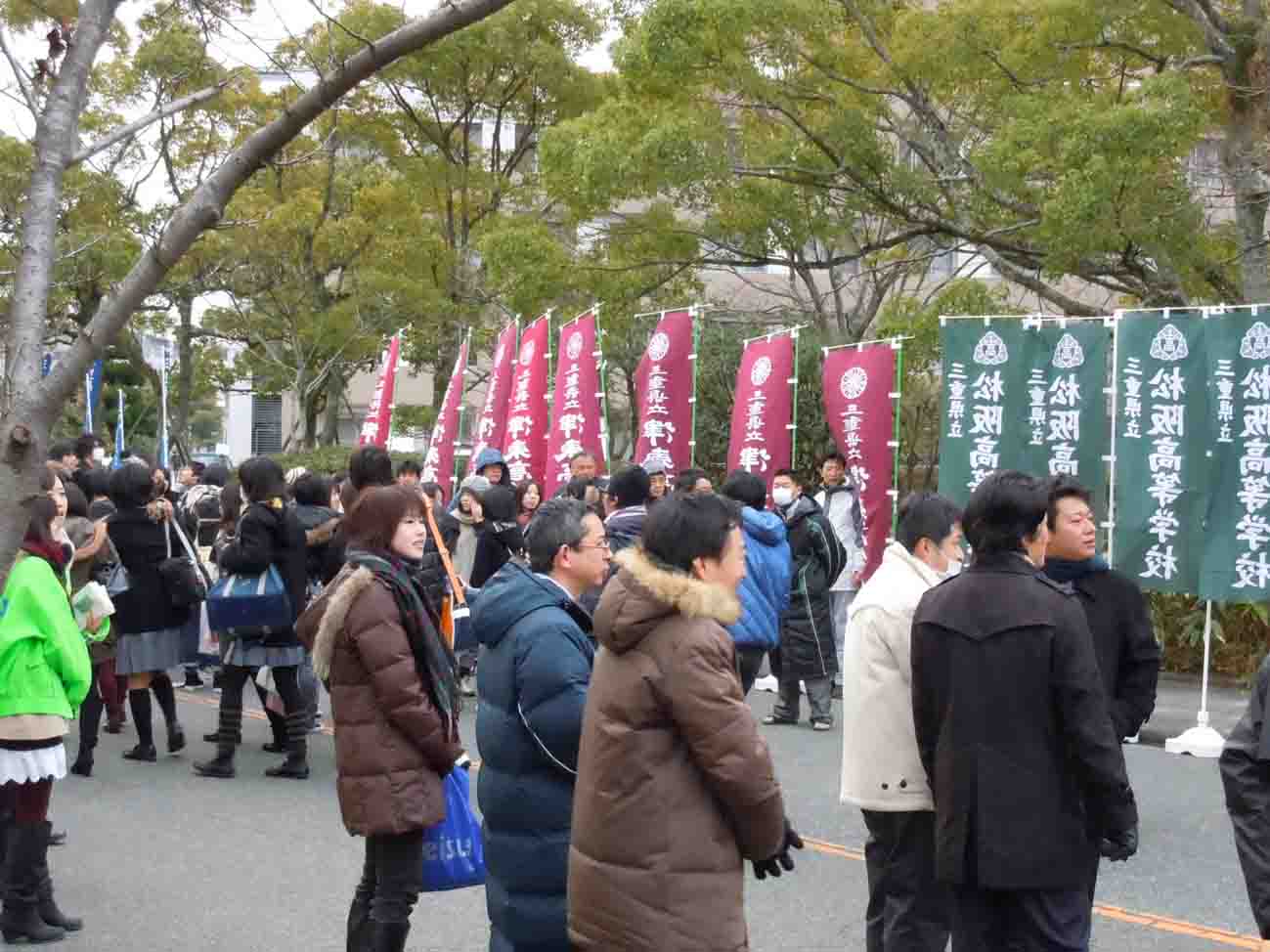 今日1月15日から大学入試センター試験が始まりました。 会場となる三重大学には多くの受験生たちとその受験生を応援する人たちでいっぱいになっていました。その中でもひときわ賑やかだったのが津東高校でした。 クラス数と同じ8本の旗をなびかせて、岡谷校長はじめ、小林・白井両教頭、北出進路指導主任、進路指導部の先生方、そして第3学年の豊吉学年主任を筆頭に3年担任の先生方が勢揃いして、東高生に熱いエールを送りました。 生徒たちは、担任の先生方の温かい言葉にほっとし、それから、きりりとした表情に変えて、それぞれの試験会場に向かっていきました。 大学入試センター試験は、初日の今日は、公民・地理歴史・国語・英語の試験が行われ、2日目の明日、数学・理科の試験が行われます。