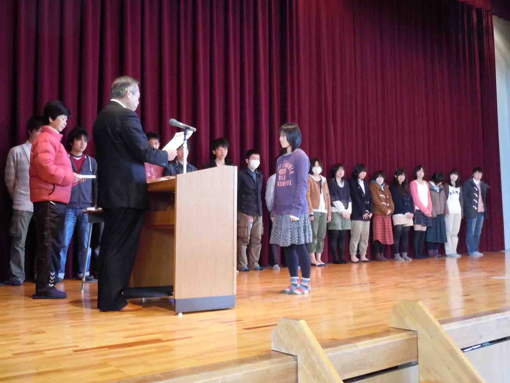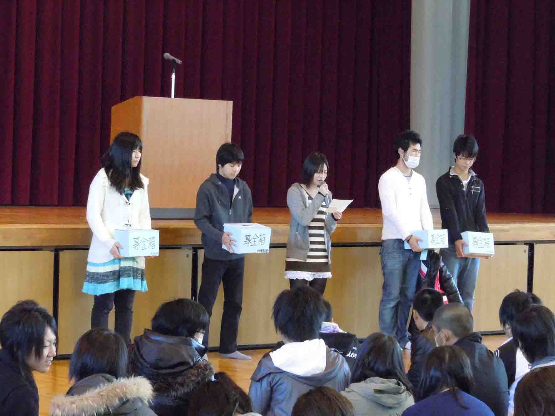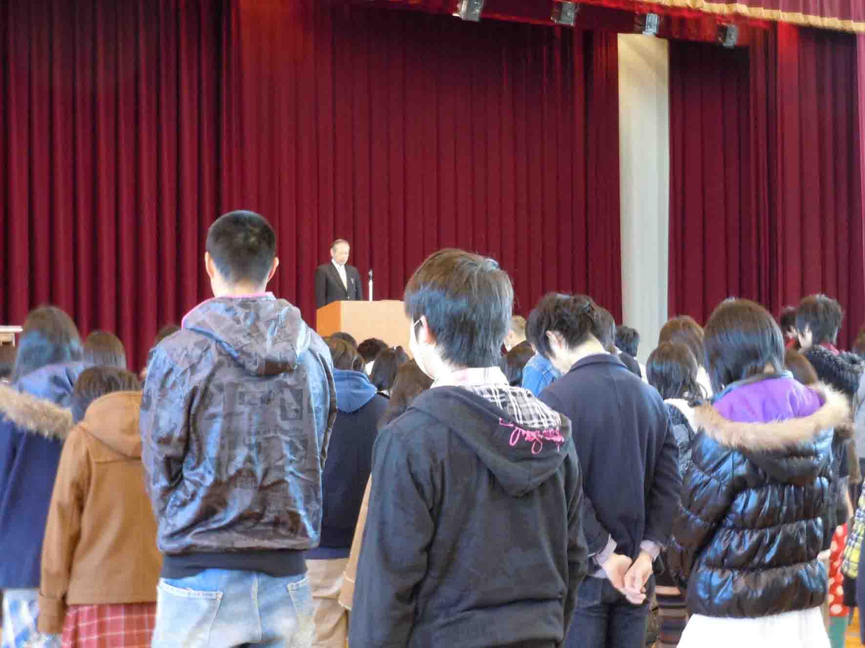 今日、全校集会が開かれ、表彰伝達式と平成23年度前期生徒会役員の立ち会い演説会が行われました。 それに先だって、岡谷校長先生より全校生徒に、今月起きた東北関東大震災についての思いが述べられ、全校を挙げて、犠牲になられた方への黙とうが行われました。 黙とうの後、生徒会から義援の募金についての話がありました。すでに本校では、ボランティア部のみなさんも募金活動を始めています。みなさんの善意が、被災者のみなさんの支えになればと思います。 その後、クラブの活躍とマラソン大会の表彰伝達式が行われ、平成23年度前期生徒会の役員立候補者の立ち会い演説会が行われました。