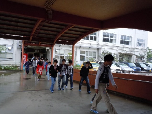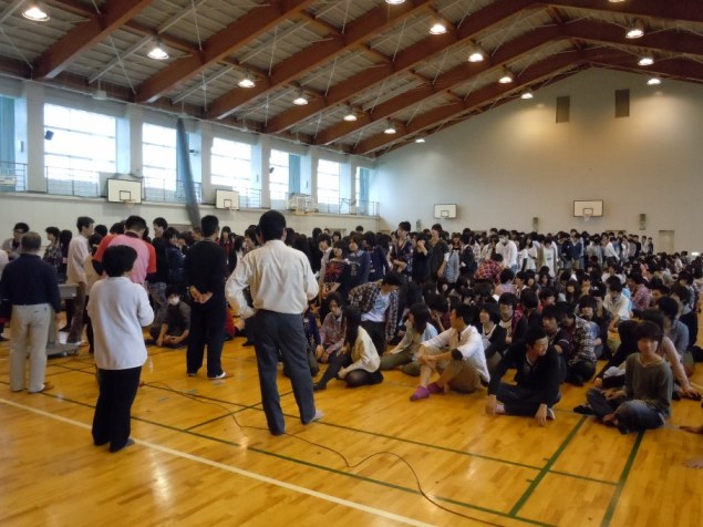 雨天のため本来の避難所であるグラウンドには集合できませんでしたが、震災時に一次避難所となる体育館へ集合場所を変更して行いました。緊急地震速報(訓練用)の後、避難経路を確認して避難訓練を行いました。