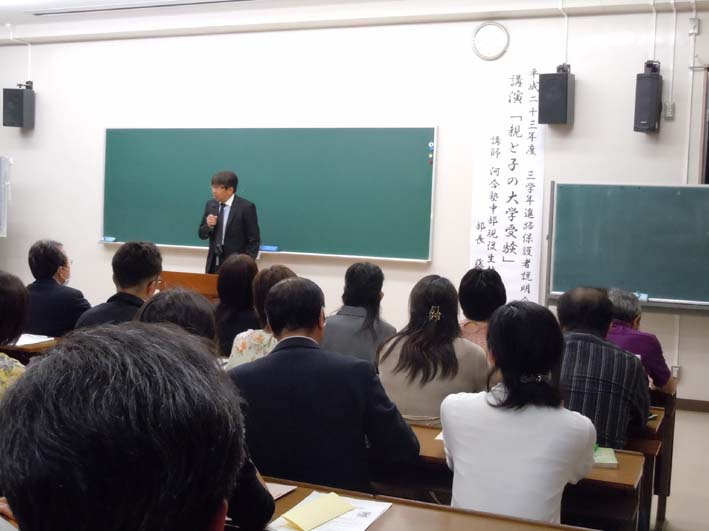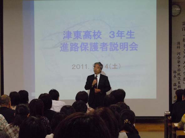 本日、3年生の保護者を対象に進路説明会が開かれました。 岩間校長の挨拶に続いて、北出進路指導主事より津東高校の進路状況と大学入試のシステムについての説明がありました。また、芝学年主任が、第3学年の現状について報告しました。参加された保護者の数は146名でした。会場の視聴覚教室は満席となり、保護者の皆さんの、大学進学に対する真剣な思いでいっぱいとなりました。 後半は河合塾の中部現役生教室事業部長の藤田泰明先生に、「親と子の大学受験」というタイトルで講演をいただきました。 3年生のみなさんはセンター試験まであと200日あまりです。国公立大学やそれぞれの夢を目指して最後まで頑張り抜いて欲しいと思います。