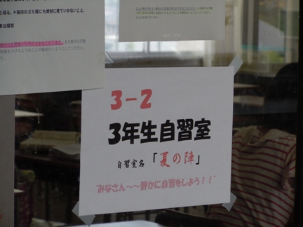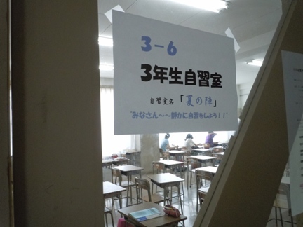 「 3−6 自習室名 夏の陣 」と書かれた教室の中では、20名ほどの3年生が静かに勉強していました。お互いに切磋琢磨して高めあってほしいと思います。