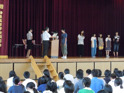 始業式に先立って表彰伝達式が行われ、夏休みに活躍した、演劇部、弓道部、ダンス部、フェンシング部のみなさんが表彰されました。