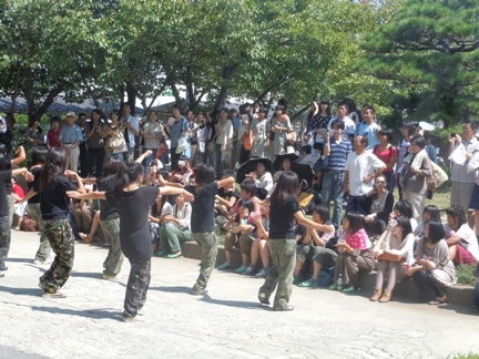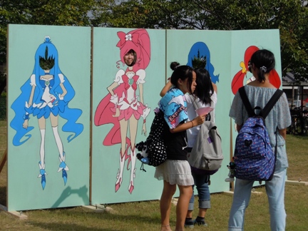 本館前庭の風景です。左から、2年2組のプリキュアパネル、ダンス部、有志のギター。