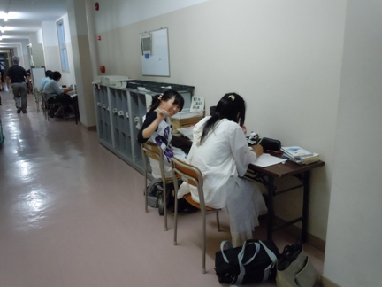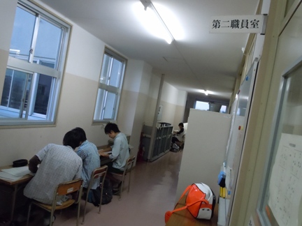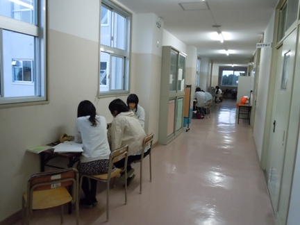 3年担任室前の廊下では、先生に質問待ちの多くの3年生が勉強しています。