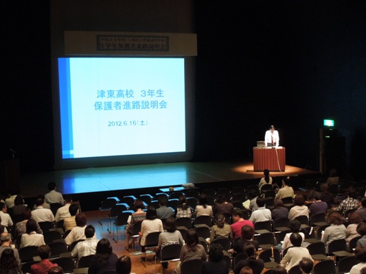 6月16日(土)、総合文化センターの小ホールを会場に、「3年保護者進路説明会」を開催しました。 本格的な受験シーズンを迎えるにあたって、いろいろな不安を感じてみえる保護者もおありではないでしょうか。このような時こそ、学校と家庭とが密接に連携を図っていくことが大切なのだろうと思います。今回の説明会が子どもたちの進路決定・進路実現の一助となることを期待しています。 主な内容は以下のとおりです。 ○校長挨拶 ○担任紹介と挨拶 ○学年の現状について ○本校の進路状況と大学入試に向けて ・今春の入試結果、津東高校の結果 ・進学にかかる費用、奨学金など ・大学入試のスケジュール、出願方法 ・入試のしくみ ・今後の学習スケジュールと注意点 ・学部学科を選ぶにあたって