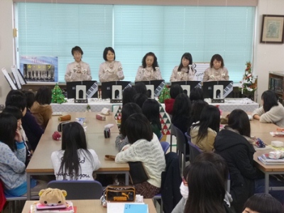 本日の4限目に、1年生1・2組の音楽(選択)と3年生の教養講座合同で、ハンドベルの演奏鑑賞と体験を行いました。 演奏を聴かせてくださったのは、津市を中心に活動されているハンドベルグループ「ル・レーブ」のみなさんです。クラシックや歌謡曲、ディズニー音楽などさまざまなジャンルの音楽をあたたかいハンドベルの音色にのせて、われわれを楽しませてくれました。 昼休みにも、図書館を訪れた生徒たちにハンドベルの演奏を聴かせてくれました。ジングルベルなどXmasの曲もあり、生徒たちは一足早いXmas気分を味わい、心あたたまるひとときを過ごしました。 「ル・レーブ」のみなさん、ありがとうございました。