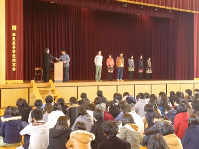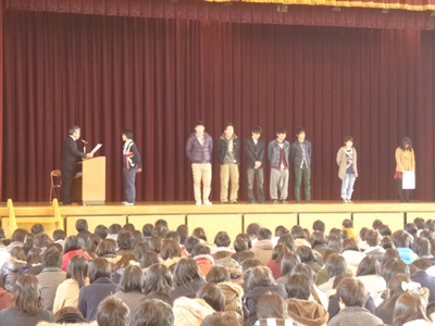本日、2学期の終業式を行いました。 校長は先日訪れた東北の様子に触れられ、「自分の目で見て、歩いて、汗をかいて、行動することが大切なんだ。テレビなどでは決して伝わることのない空気を自分の肌で感じ、新しい自分の未来を切り開くことができるよう行動し、これからの社会をより良くしていけるように学んでいってほしい」と生徒たちに語りかけました。 この他、2学期に活躍したクラブや個人の表彰、少し遅くなってしまいましたが、後期生徒会役員の認証式を行いました。
