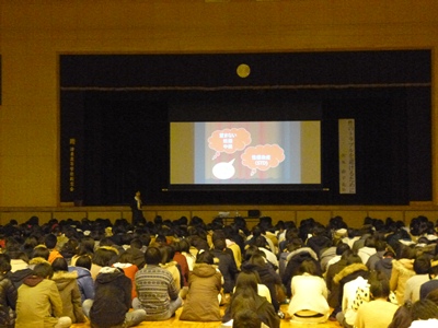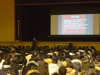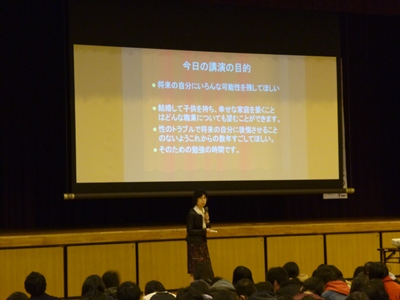 本日の7限目に、「金丸産婦人科」院長の金丸恵子先生をお招きし、『性教育講座』を実施しました。 テーマは「性のトラブルを避けるために」でしたが、女性が基礎体温によって自身の性周期を理解することの大切さや、避妊方法、性感染症(STD)などについてお話いただきました。特に、10代での安易な性行為による性感染症への罹患が20代で子宮頸がんを発症させるリスクを高めることを紹介していただきました。具体的な事例も織り交ぜながら、「いい恋愛をしてください」「対等なつき合いをしましょう」「十分な準備ができるまではセックスしないようにしましょう」と締めくくっていただきました。 ご講話いただいた金丸先生、ありがとうございました。