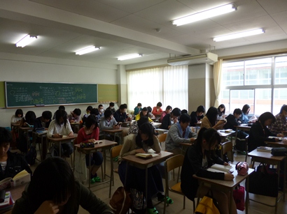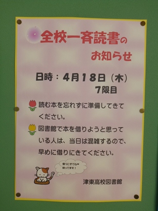 4月18日(木)の7限目、総合学習の時間に「全校一斉読書」に取り組みました。それぞれの生徒が好きな本を教室で読むという内容です。図書部からは一週間ほど前から「好きな本を持ってくるか、図書館に借りに来てください」とアナウンスがありました。当日の昼休みは本を借りに来る生徒で図書館がごったがえしていたそうです。7限目は思い思いの本を手にして、物音一つたてずに集中して本を読んでいました。良書に出会い、良い読書習慣を身につけてもらいたいものです。