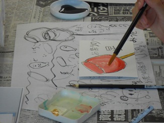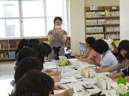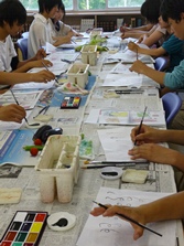 本日放課後、第1回図書館文化講座「絵手紙を作ってみよう!」を開催しました。当初は参加希望者が少なくて心配したのですが、美術部の協力もあり、31名の生徒が参加して楽しく作品を作ることができました。