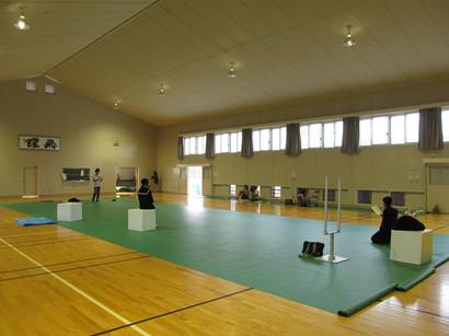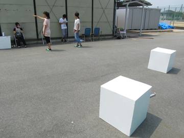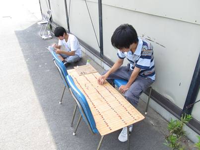 上の写真は左から@部室プレハブ前で稽古している様子 A照明担当が操作版を描いてビースで操作バーを想定して練習している様子 B武道場で衣装を着けて稽古している様子です。