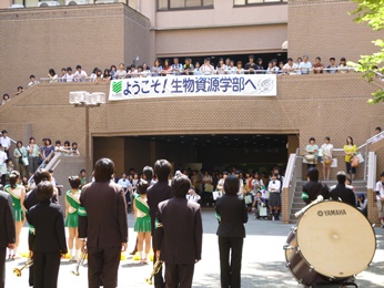 初日に行われた生物資源学部の前では三重大学の応援団が高校生にエールを送っていました。また人文学部では考古学に少しでも触れるために「まがたま」作りの実習が行われ、参加する生徒もいました。