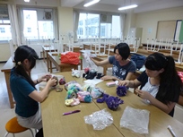 クイズの答え 一番右は書道部の炭をする機械です。この機械で擦った墨を使って、何メートルもある大きな紙に文字を書くパフォーマンスに取り組んでいます。 真ん中はボランティア部が「シュシュ」を作っているところです。当日は手作りのミサンガなども販売されます。