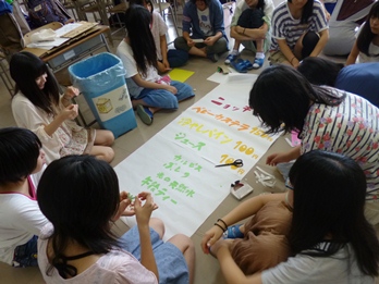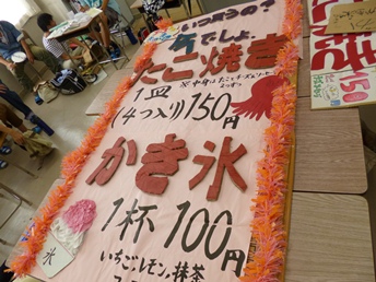 1組 さーてぃーわんちゃおず 「私たちの餃子とかき氷を食べたらやみつきなること間違いなし!」 2組 スナックなおこ 「学園祭で唯一の焼きそば店です!冷たいデザートもあるわよ〜ん❤」 3組 きのきの。〜いつ食べるの?”今”でしょ〜 「津東の元祖☆たこ焼き屋 かき氷はじめました。」 4組 ヒジィー 「ヒジィーが厳選した夏を代表する屋台メニューがここに集結!」 5組 おしゃべりくまごろう 「元気いっぱいの5組がお送りする、最高の料理をお届けします。」 6組 FUNKY 「FUNKYな料理でみなさんをもてなします!」 7組 Honey❤ 「あげタコ・フライドホテト・かき氷。どれも本格的な仕上がりです。」 8組 はっちゃん堂 「コ○ダ珈琲に挑戦!なんちゃってシロノワール食べてみ!!」
