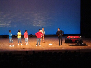 ●前任の部長Y君(3年)のコメント 1年生と一緒に舞台に上がるのが初めてということ以上に、自分たちの学年にとっては3月以来の舞台だったので、とまどいや緊張感がありました。でも初めの方で(観客から)笑いがとれたので、吹っ切れて楽しくできました。これからは本当に1年生だけの活動になるけど、しっかり頑張ってほしいです。