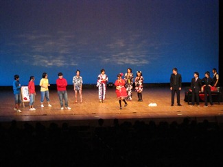 ●顧問N先生のコメント ここまで1年生のみの少人数の活動を続けてきて、夏の公式コンクールでも大人数で活動している高校を見て羨ましいなぁと感じていましたが、今回は一時的ではあっても、大人数で活動できたので、合同練習やリハーサルの時からどこか「夢のような」気持ちでいました。いちいち言葉でアドバイスを受けなくても、先輩の活動を「見て学ぶ」ことの大切さを改めて感じました。公式コンクールの脚本がシリアスで抽象的な心理劇だったのに対して、今回はかなり具体的で、しかも笑いを取る内容だったので、クラブとしてはキャパシティーを広げるとても良い機会になったと思います。