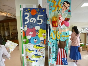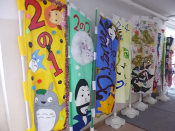 本校の学園祭では24クラスすべてが「のぼり旗」を製作します。本来なら正面の門をくぐった辺りに24本の旗がたなびくはずでした。残念ながら時折、小雨がちらつく生憎の天気のため、校舎内での展示をなりました。