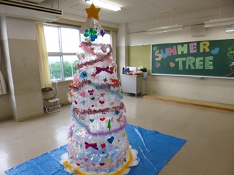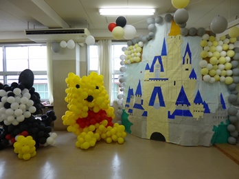 バルーンでキャラクターをかたどった2年3組、ペットボトルでツリーを作った2年6組、体育館の壁に○○先生の似顔絵をかけた2年2組。