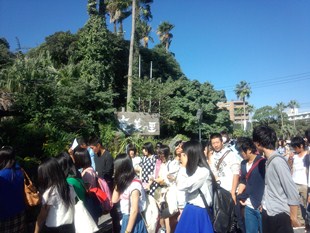 指宿から鹿児島へ薩摩半島を北上しました。右手に錦江湾、右奥に喜入の石油備蓄基地が見えました。曇りがちであった天気は、雲一つない快晴となりました。暑いぐらいです。また車中から桜島の噴火をみることもできました。桜島は、今年に入って600回を超える噴火があったそうです。