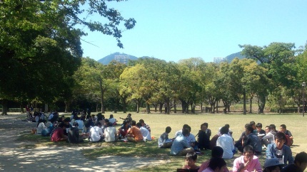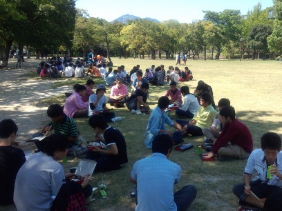 バスでお弁当を受け取って、みんなで芝生で昼食です。天気が良いので、気分最高、会話も弾んでいます。