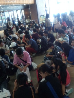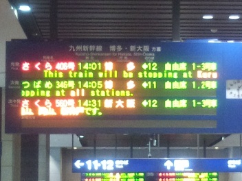 新幹線を待ちます。さくら406号(14:01発)とつばめ346号(14:05発)で、博多に行きます。博多で、のぞみ42号(15:05発)に乗り換え、京都に向かいます。