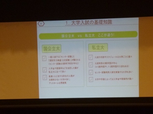 大学入試の基礎知識として、国公立大学と私立大学の違いや、大学入試の仕組み、入試問題の出題構成の説明がありました。例えば、入試問題は100点満点の問題の内、基本問題50点、応用問題30点、難問20点。合格点が6割から7割、基本問題を取りこぼすことなく、確実に解き、応用問題の半分ができれば合格ラインに到達できる、つまり、「基本問題」を押さえることが合格への近道なのです。