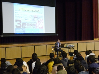 少年ジャンプの編集者を長年つとめた茨木政彦さん(津市出身)を招いて、本日、6・7限に1・2年生を対象に講演会を行いました。「働くということ」について少しでも理解を深めることを目的に、編集者の役割や苦労、やりがい等について話をしてもらいました。マンガ家が〆切りに終われるエピソードの紹介もありました。