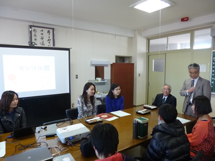 本日、昼休み、モンゴル国立大学法学部日本法センターから4人の女子学生と本校生徒会執行部8人が交流する機会を校長室で持ちました。来校した4人は名古屋大学法学部がモンゴル国立大学に設置しているモンゴル日本法教育研究センターで、法律について学んでいる学生です。1月14日から三重大学人文学部に短期留学中で、日本の高校生と交流をもちたいということで、本校を訪問しました。