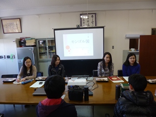 自己紹介の後、パワーポイントを利用してモンゴルの地理、生活習慣、伝統的な服装、祭りなどの伝統行事についてモンゴルの大学生から説明がありました。 「首都ウランバートルに人口の2分の1が集中している。スフバール広場がウランバートルンの中心地である」 「ゲルは16世紀から今の形になり、冬は暖か、夏は涼しい。ゲルによってできる影で時刻が分かる」 「ゲルの中の場所によって、家の主人、女性と子ども、客人と座る場所が決まっている。二本の柱に支えられ、その間を通ってはいけない」 「民族服のデールは立ち襟、長い袖、太いベルトなど、遊牧民の生活からできた服装である」 「正月を祝う祭りと、ナーダムという祭りが二大祭り。正月は春を祝い、2月、一方ナーダムは夏の祭りで、1921年に外国の侵攻から国を守ったことを記念した祭りである」