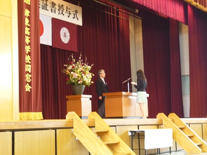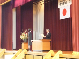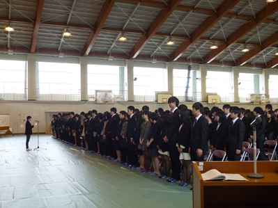 続いて、学校長式辞。「高校における学びが、先生から丁寧に教わり、こなすだけになっていないか」と普通科教育の課題を指摘し、「努力することはもちろん大切だが、何のために学ぶのか、考える力を身につけてもらいたい」と訴えました。映画「ハンナ・アーレント」に描かれたホロコーストの中心人物、アイヒマンの「悪の凡庸」(自分の判断を停止し、与えらえた指示を淡々とこなすだけ)や、オウム真理教の事件、最近の日中・日韓関係に見られる反知性主義的な言説の危険性を例に挙げ、思考する態度を養ってもらいたいと繰り返し述べました。