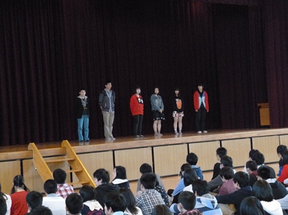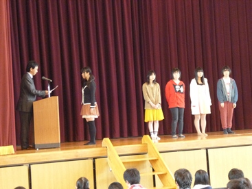 まず、後期生徒会役員6人の生徒が登壇し、後期生徒会役員を代表して会長から挨拶がありました。 「後期の活動として、生徒会誌『嶺』の編集と、クラスマッチの運営がありました。クラスマッチの運営では多少ミスがありましたが、スムーズに進行することができました。課題としては『目安箱』に寄せられたみなさんの要望を実現することができなかったことです」
