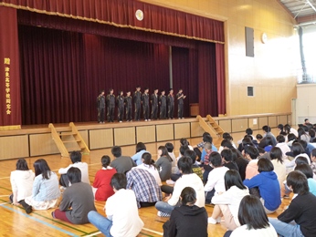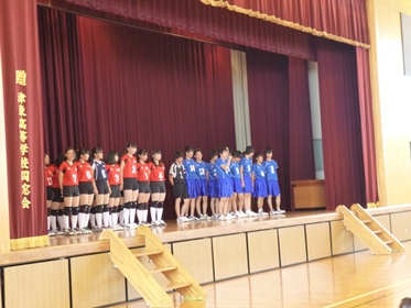 ユニフォームやチーム・ジャージに着替えた選手が他の生徒と向き合って座りました。教頭と生徒会長から激励の言葉、次に県総体に出場する運動部がそれぞれステージ檀上にあがり、大会に臨むあたっての決意をキャプテンが述べました。